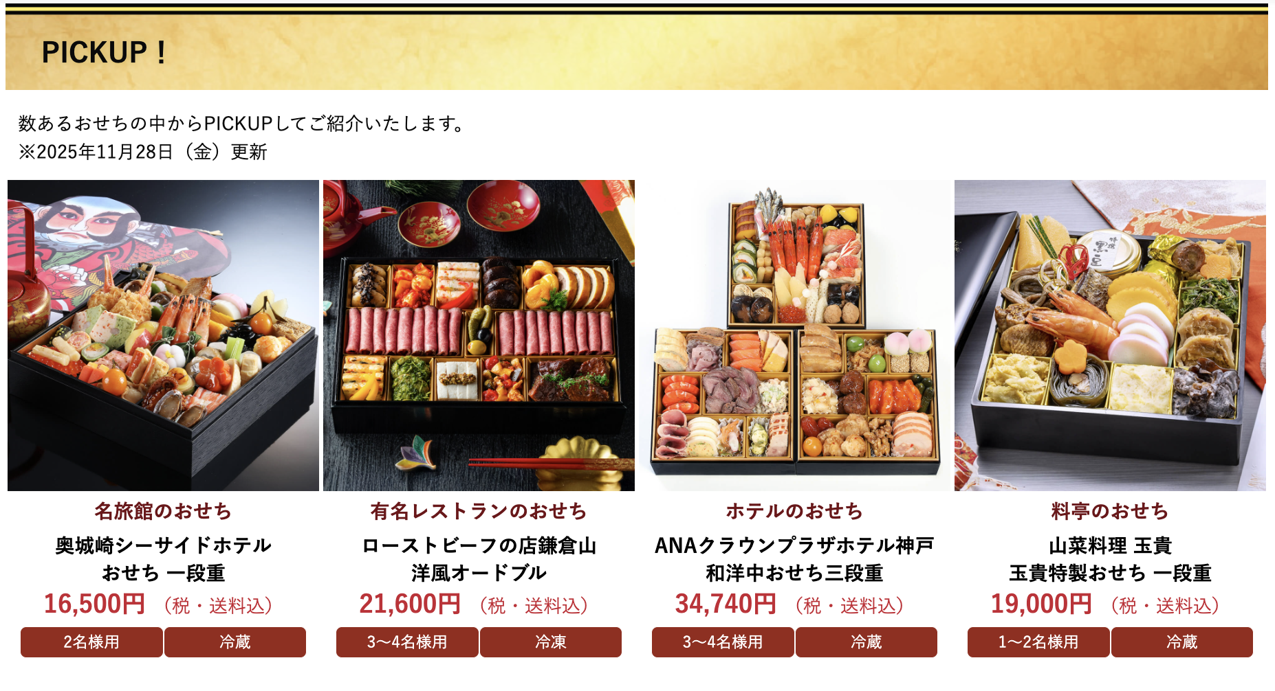 | 具体的な商品例 | 加賀屋、なだ万、京料理 濱登久など(和風三段重など) | ANAクラウンプラザホテル神戸、アル・ケッチァーノ(イタリアン)、シェラトン都ホテルなど(和洋二段重など) | おせちの鉄人セレクトグルメ(ローストビーフ、海鮮漬など) |