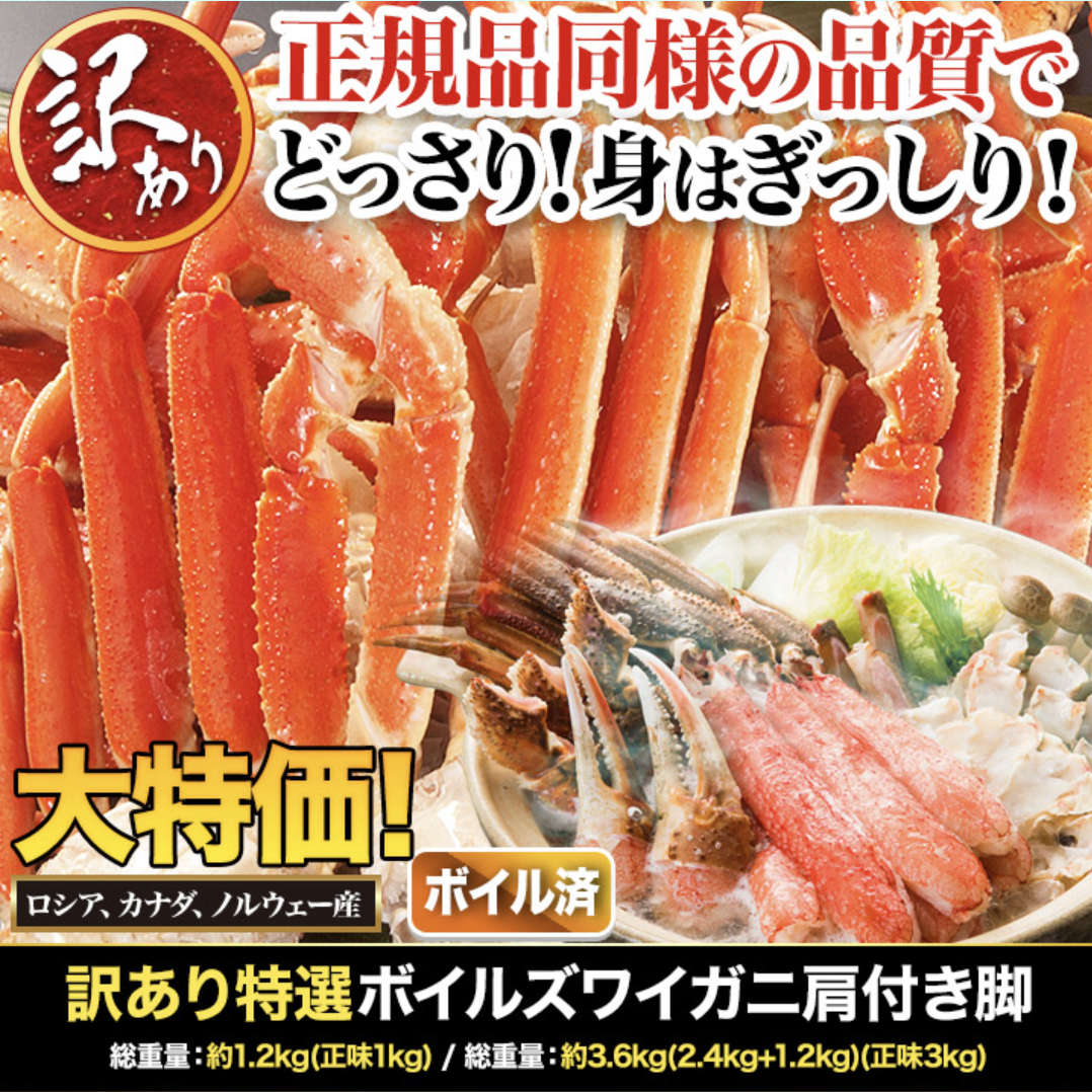 訳あり(肩付き脚など): 味や品質はそのままに、形や足折れなどで格安で手に入ります。「自宅で楽しむだけ」なら断然おトクです。