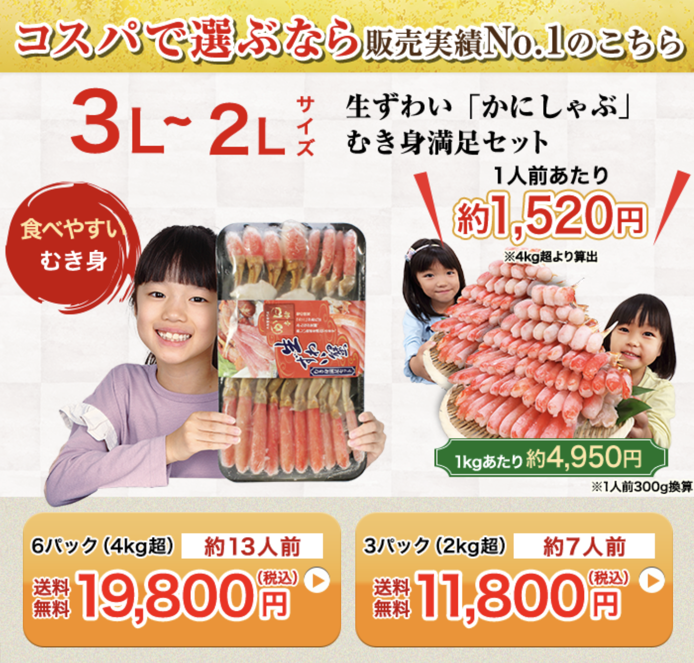 | こんな人におすすめ | 初めてカニ通販を利用する方、お子様や高齢者がいて殻を剥くのが面倒な方、とにかくたくさんの量をお得に楽しみたい家族。 |