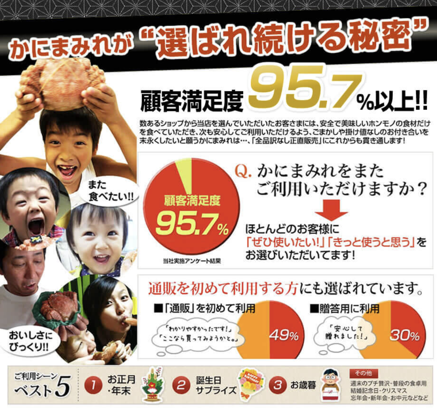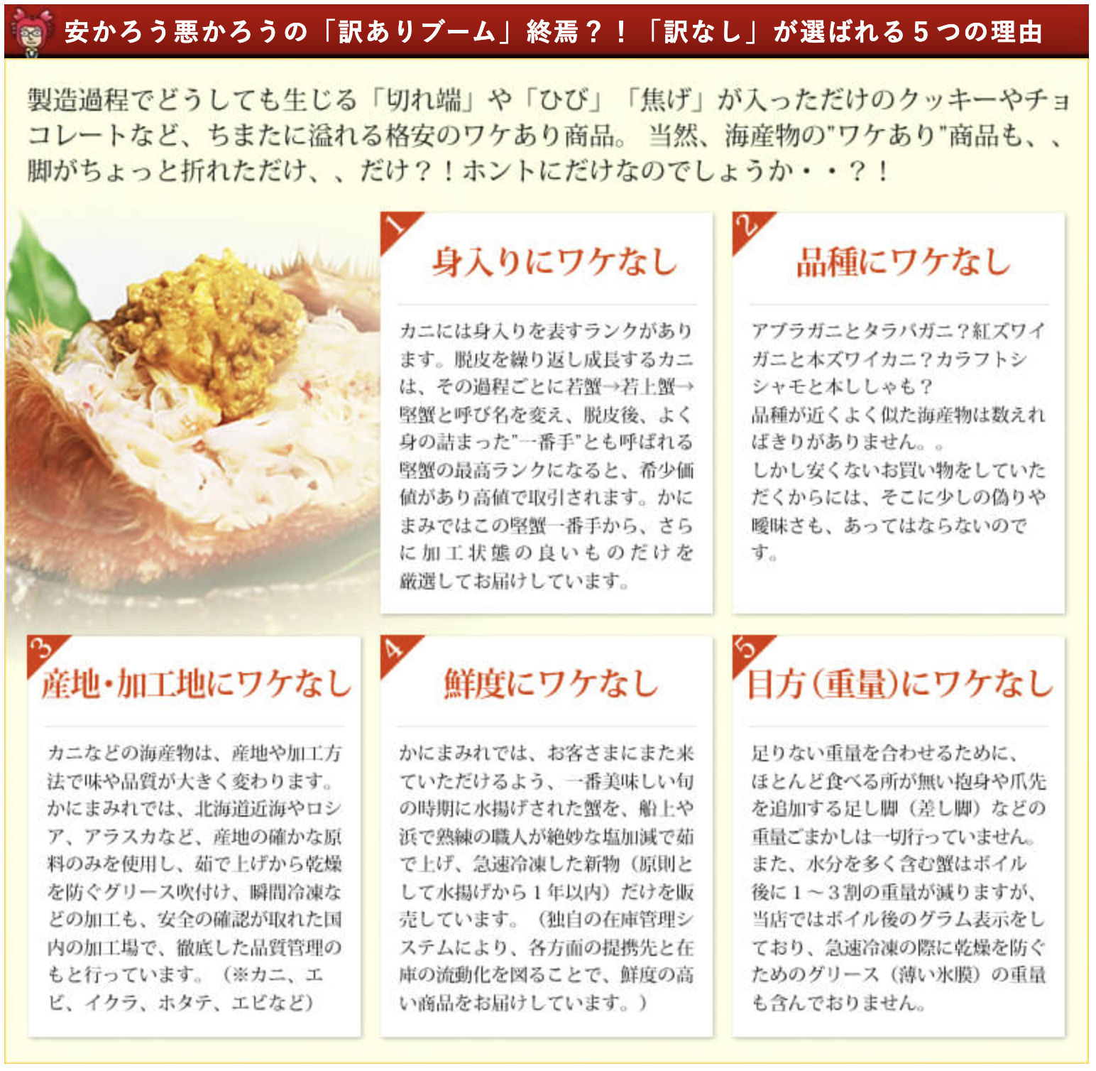 「訳あり」カニは安くて魅力的ですが、贈り物にはできません。「かにまみれ」は、足折れや傷が一切ない「訳なし」品のみを扱っています。