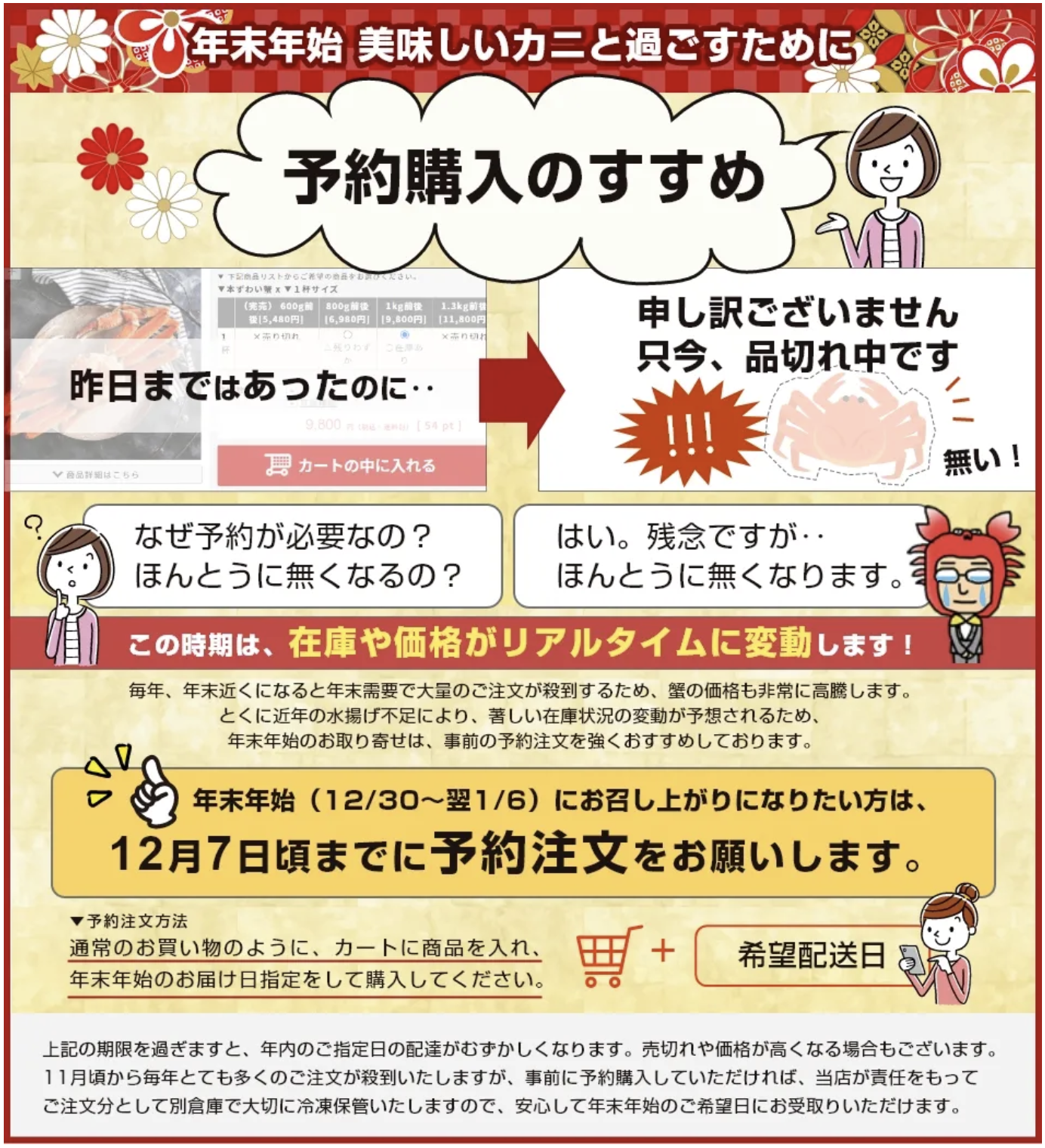 独自視点: 大切な方への贈り物や、失敗が許されないお正月などの特別なイベントで利用する際、「届いてがっかり」というリスクがゼロに近いのが、かにまみれの最大の安心感です。「信頼」という付加価値は、金額以上の価値があります。